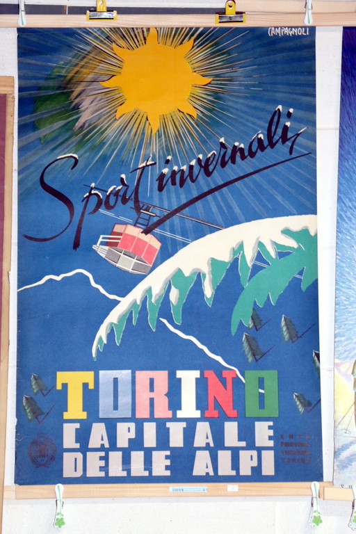61 | Affiche de tourisme Sport d'hiver ski ITALIE. Torino capirale delle alpi. Signé CAMPAGNOLI; 97,5 x 61,5 cm (petites fentes sur le coté) | 1500/1800 |