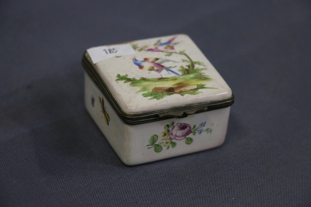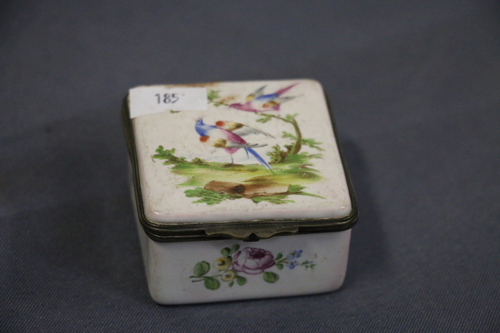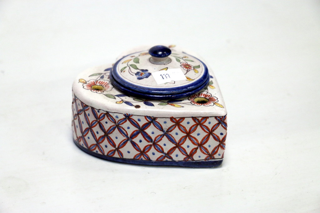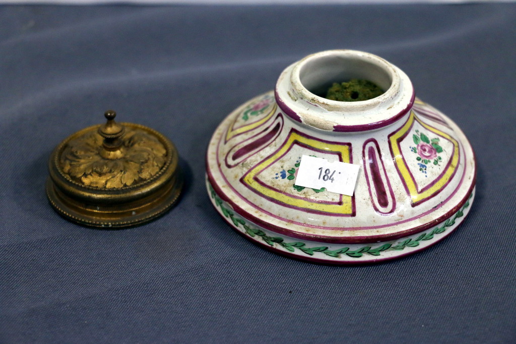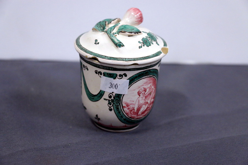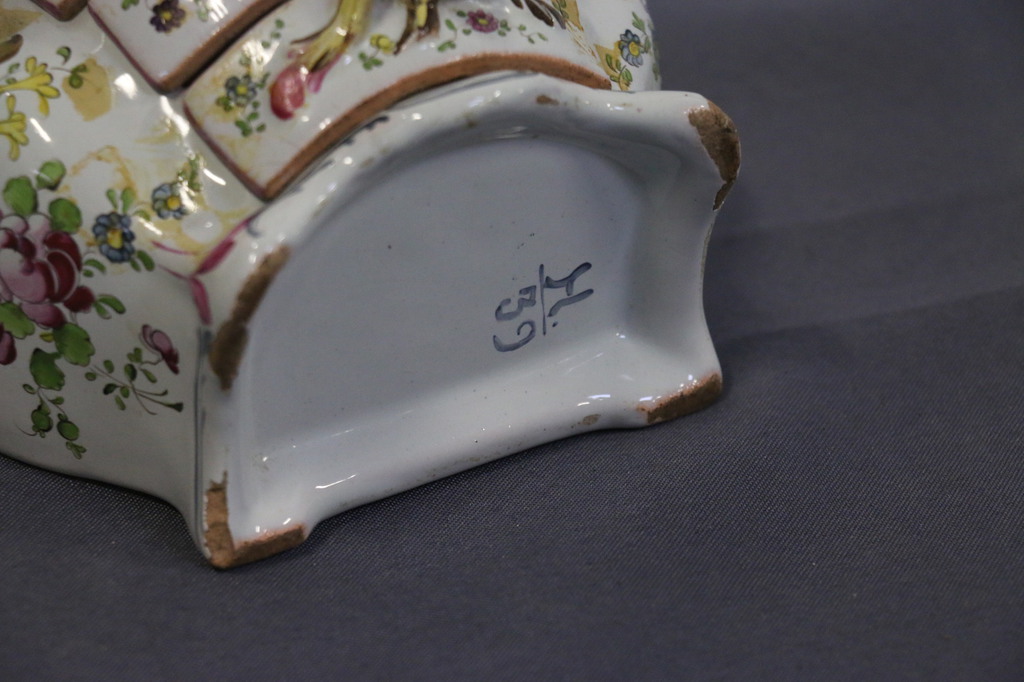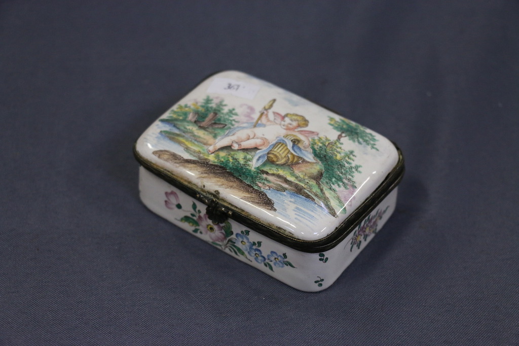 361 | MARSEILLE ?. Boite à pillules à décor à l'angelot. XIX°. Porte une signature VP. H : 3 x 9,5 x 7,5 cm | 60/90 |