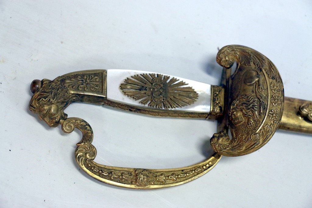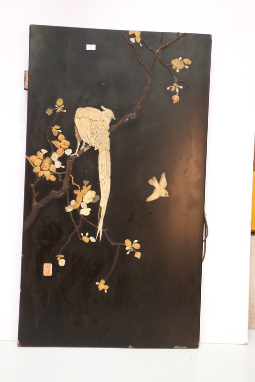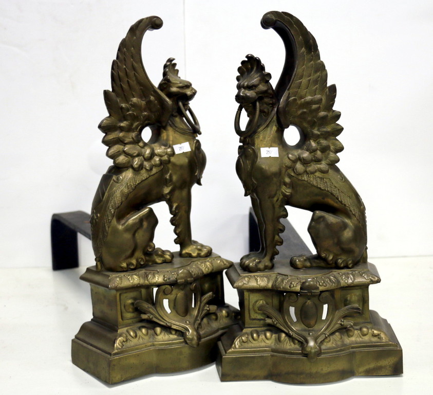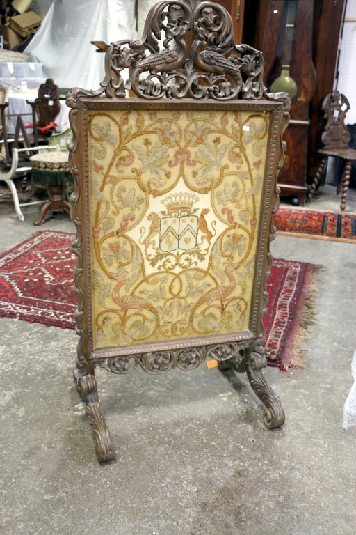 400 | Devant de feu en bois sculpté à motif de chimères et tapisserie au blason. H : 130 x 66 cm | 35/50 |