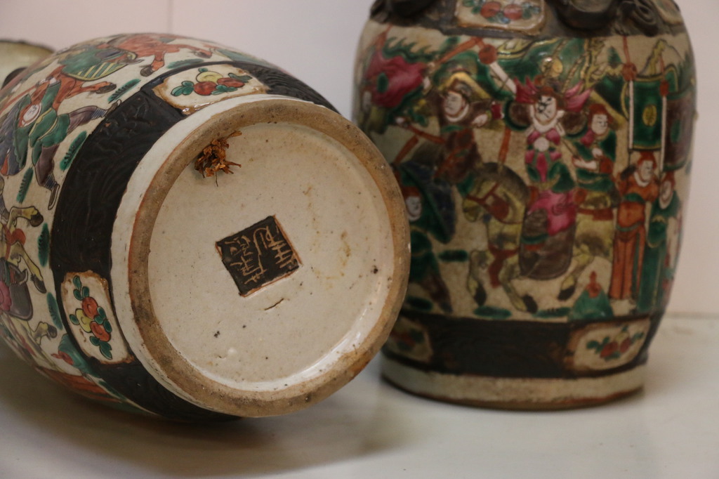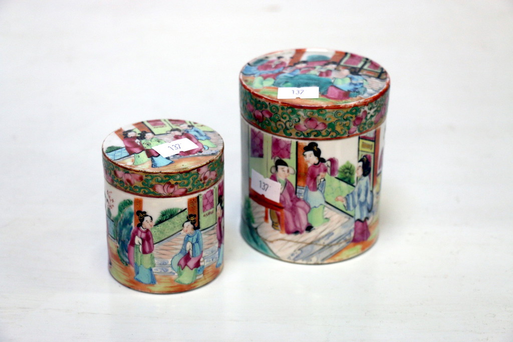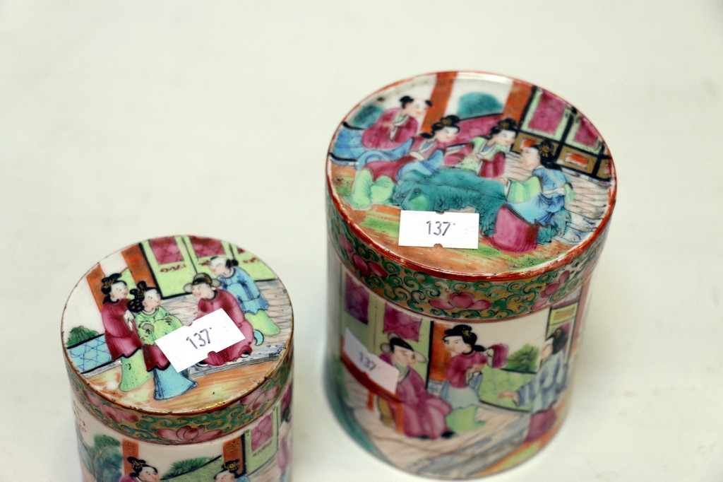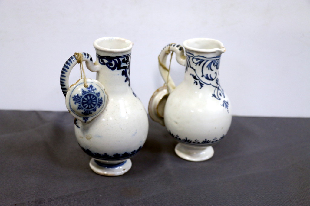379 | 2 Petits pichets couverts à décor stylisé en camaïeu bleu sur fond blanc. H : 16 cm | 30/45 |