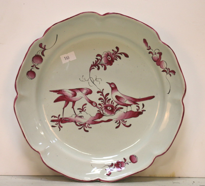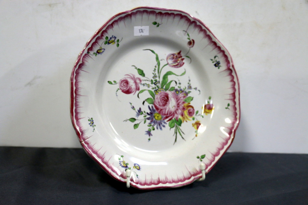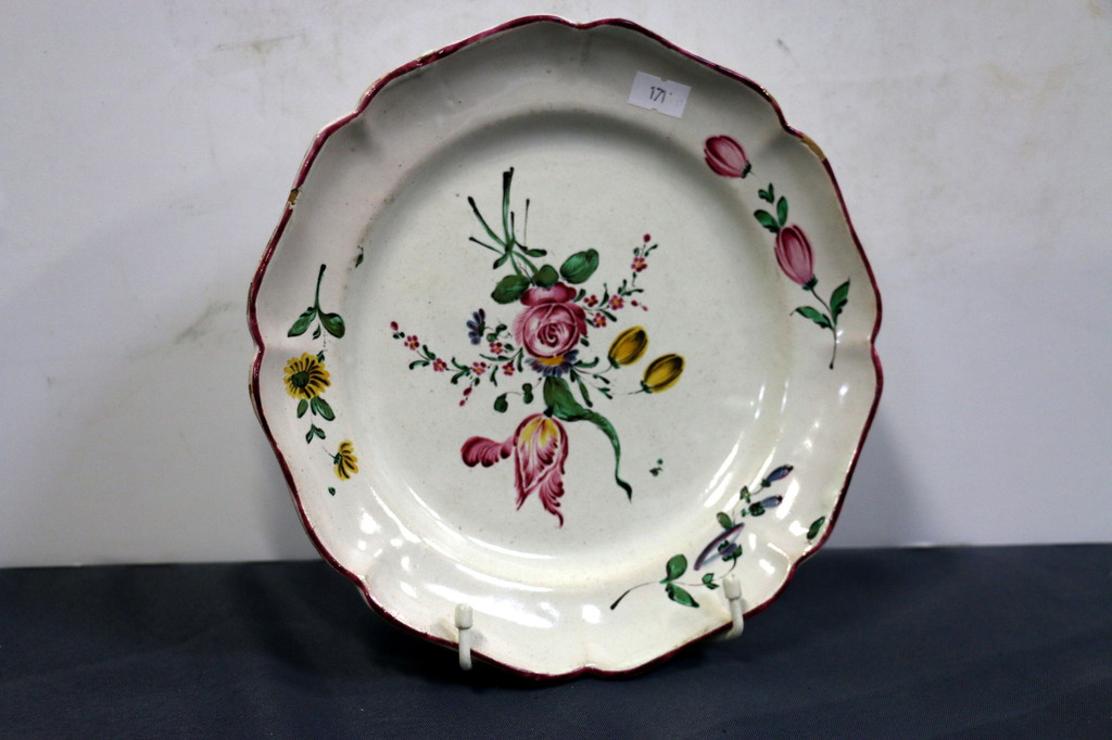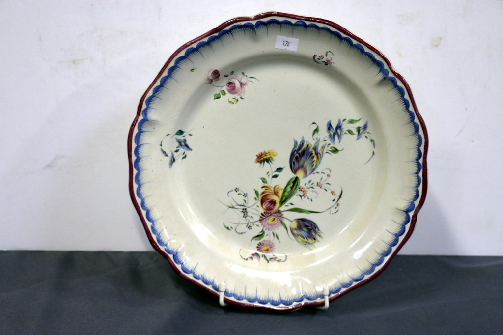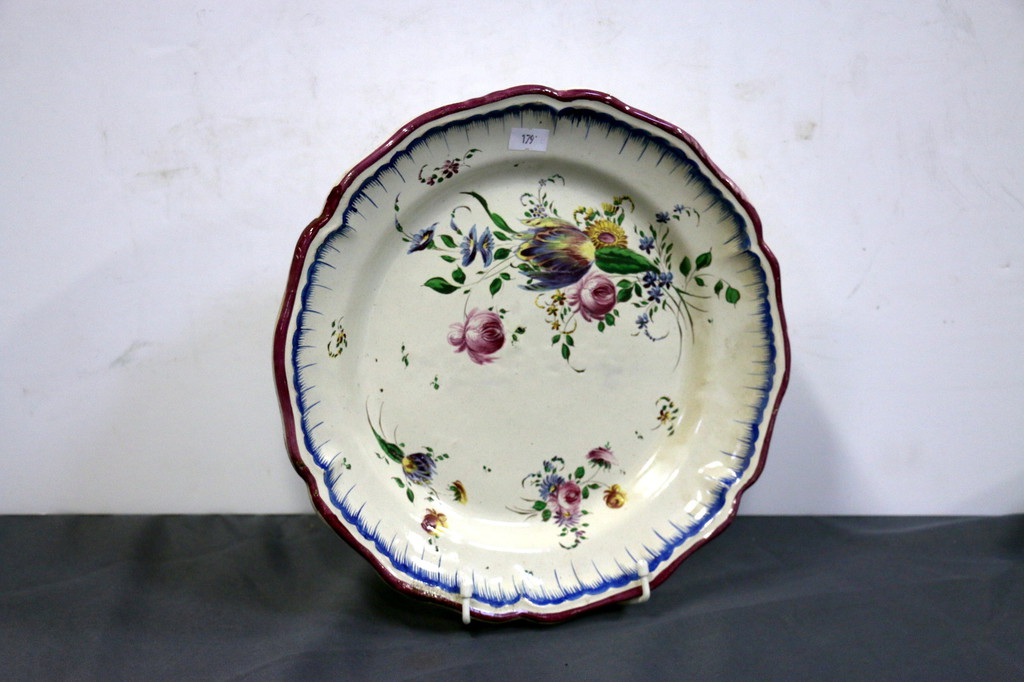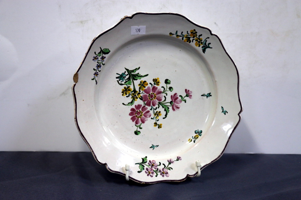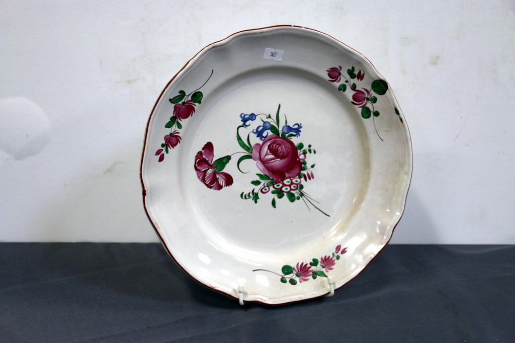 367 | EST. Plat rond polylobé à la rose et à l'œillet, brindilles fleuries sur l'aile. Diam : 29,5 cm | 20/35 |