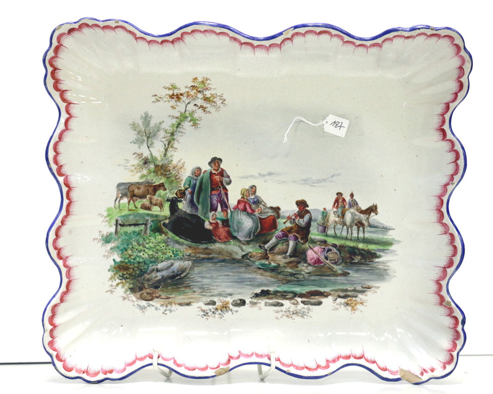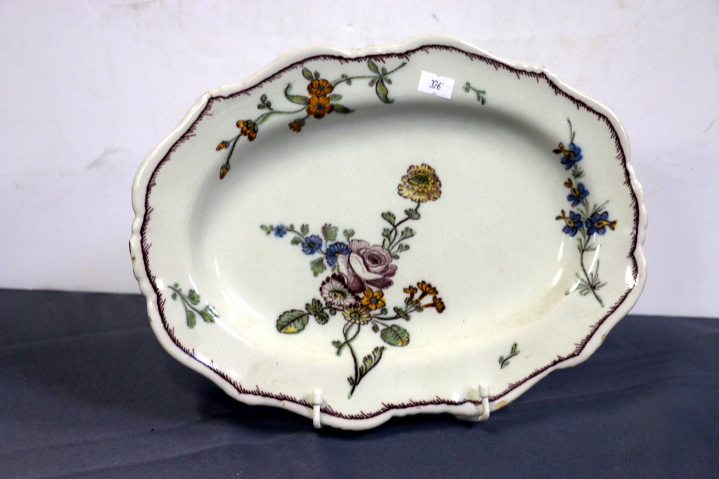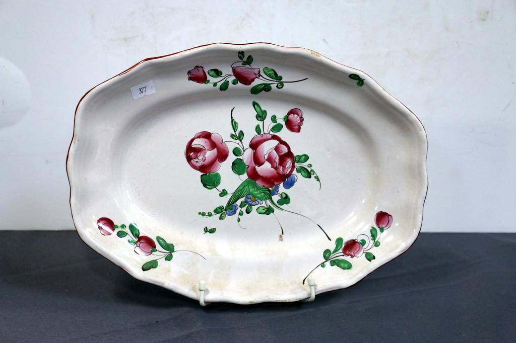 376 | MOUSTIERS (St JEAN DU DESERT?) XVIII°. Plat de forme argenterie à décor de solanées. Lgr 31 cm | 60/90 |