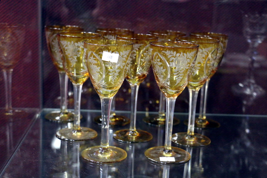 440 | Suite de 9 verres de couleur en semi cristal à décor gravé de branchages fleuris | 45/70 |