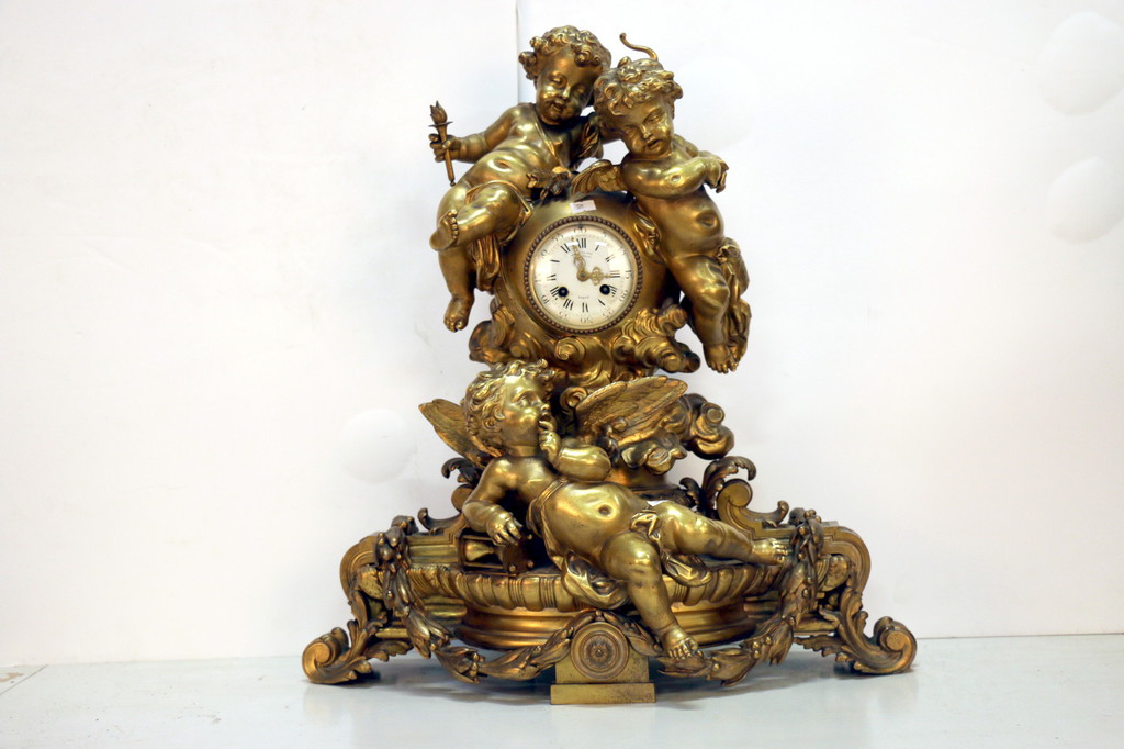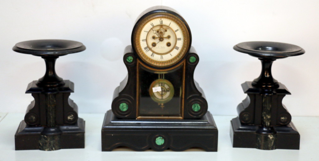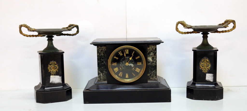 401 | Garniture de cheminée (pendule et 2 cassolettes vide poche) en marbre noir et marbre portor | 45/70 |