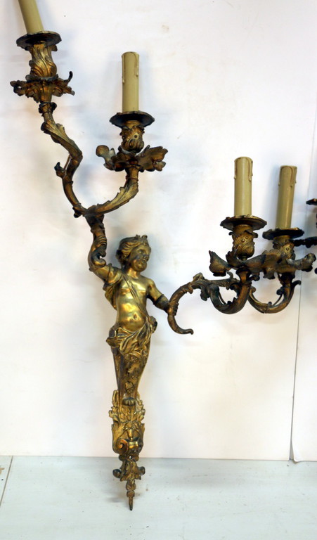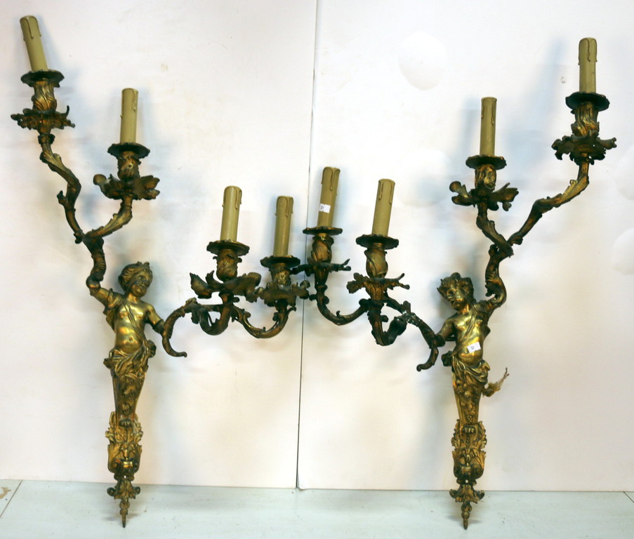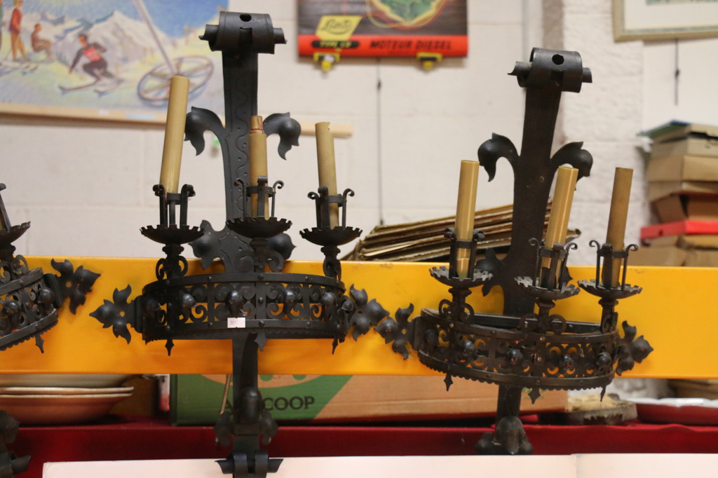 389 | Suite de 4 appliques en fer forgé à chacune 3 lumières Style Haute Epoque. H : 62 x 36 cm | 80/120 |
