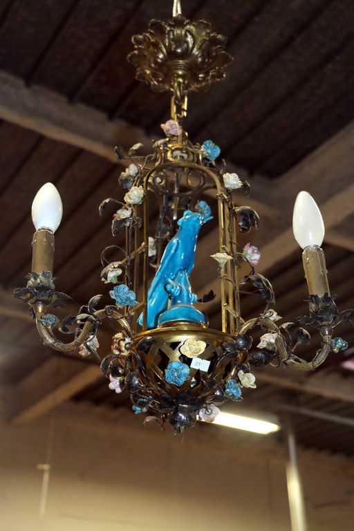 359 | Petit lustre cage 3 lumières à "L'oiseau branché et aux fleurs". H 60 x 35 cm | 80/120 |