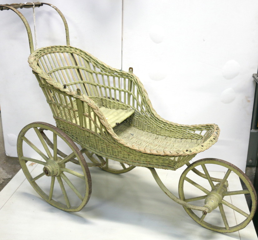 396 | Landeau à 3 roues en bois de cerclées de fer; corps en osier. Début 1900 | 50/80 |