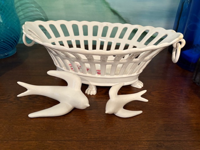 192 | Coupe à fruits en porcelaine blanche ajourée, pieds pattes de lion + 2 hirondelles | |